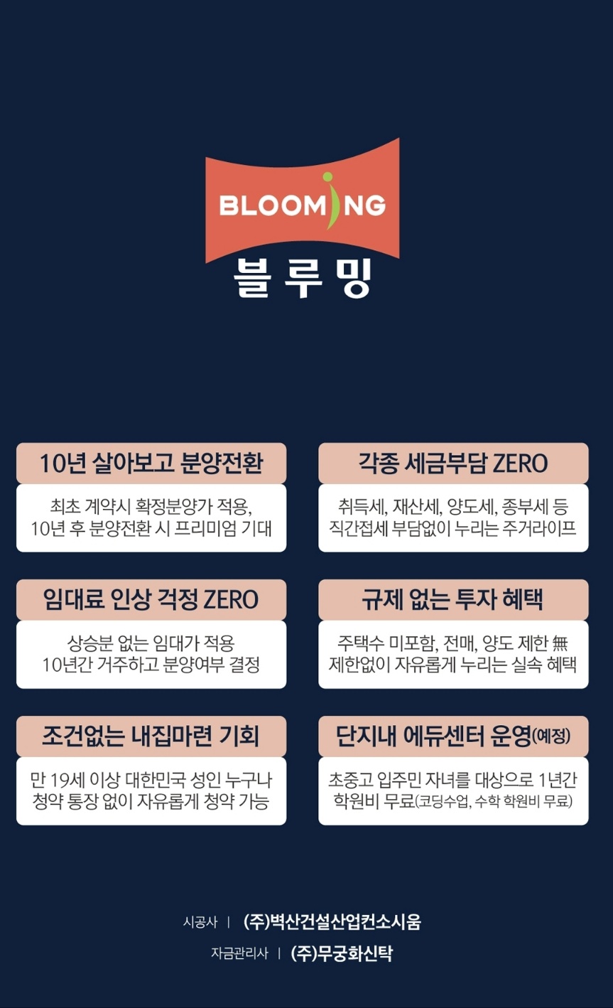 충남 아산시 온천동 일대에 공급되는 "온양온천역 블루밍" 아파트는 지하 5층~지상 49층, 전용면적 ▲59㎡ ▲84㎡A ▲84㎡B 으로 공급됩니다.단지는 청약통장 상관없이 만 19세 이상 누구나 청약 가능한 장기민간임대아파트로 10년 동안 이사 걱정 없이 장기간 거주가 가능하고, 10년 거주 만기 후 분양전환을 할 수 있다는 장점 1호선 온양온천역을 도보로 이용 가능한 초역세권 단지로 우수한 교통망을 갖춘 단지입니다.